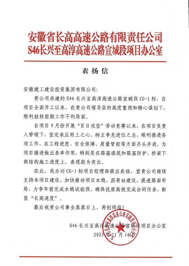 2025年11月18日,安徽省長高高速公路有限責任公司宣城段項目辦公室發來表揚信,對建工建投集團長高高速CG-1標項目在“百日攻堅”勞動競賽中的優異表現予以高度贊揚。