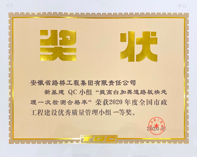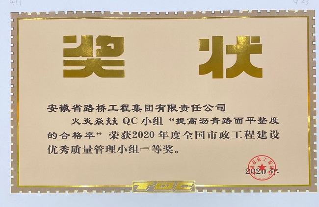 選送的3項QC成果中,公司新基建QC小組“提高白加黑道路板塊處理一次檢測合格率”和火炎焱燚QC小組“提高瀝青路面平整度的合格率”兩項作品榮獲2020年全國市政工程建設優秀質量管理小組一等獎,月臺路QC小組“提高EPDM塑膠面層平整度的合格率”榮獲二等獎。