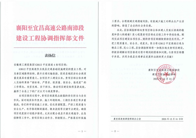 近日,建工建投集團G3612平宜高速4標項目收到了南漳縣交通運輸局、襄陽至宜昌高速公路南漳段建設工程協調指揮部發來的表揚信。