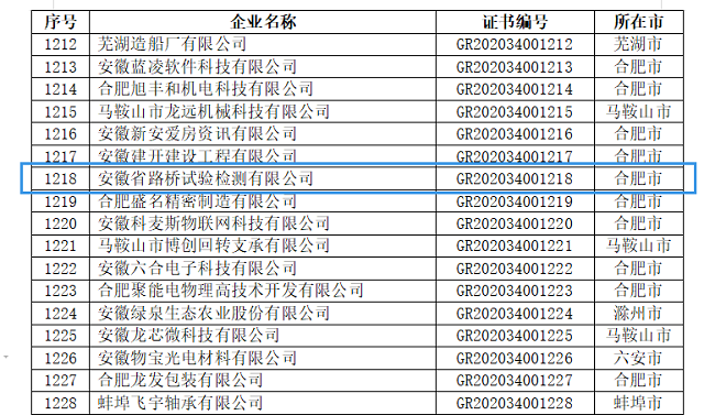 2020年12月4日,安徽省路橋試驗檢測有限公司(簡稱“檢測公司”)榮獲安徽省2020年度第一批“高新技術企業”認定資格(證書編號GR202034001218),成為安徽省路橋工程集團有限責任公司二級機構第一家高新技術企業,標志著檢測公司的企業技術實力和科研成果獲國家認可,正式邁入國家高新技術企業行列。