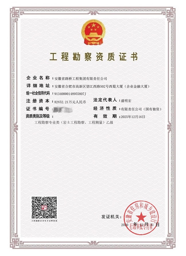 日前,經省住建廳核準,安徽路橋集團獲批工程勘察專業類(巖土工程勘察、工程測量)兩項乙級資質,再次實現資質范圍拓展新突破,填補了公司在工程勘察領域的資質空白。