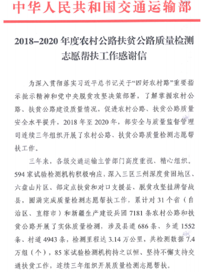 近日,交通運輸部對參加扶貧檢測工作單位的公開感謝信中,檢測公司名列其中。