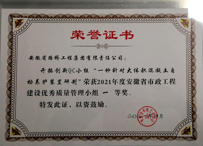 近日,從安徽省建設行業質量與安全協會及安徽省市政協會傳來喜訊,安徽路橋集團四分公司祁門EPC項目QC小組完成的《一種針對大體積混凝土自動養護新型裝置研制》榮獲安徽省建筑企業2021年QC小組成果發布會一等獎、安徽省市政工程建設優秀質量管理小組一等獎,《提高預制梁外觀驗收合格率》榮獲安徽省建筑企業2021年QC小組成果發布會二等獎,同時準備申報中國市政協會QC優質成果。