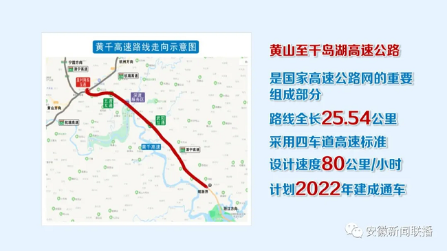 黃山至千島湖高速公路是國家高速公路網(wǎng)的重要組成部分,路線全長25.54公里,采用四車道高速標準,設(shè)計速度80公里/小時,計劃2022年建成通車。