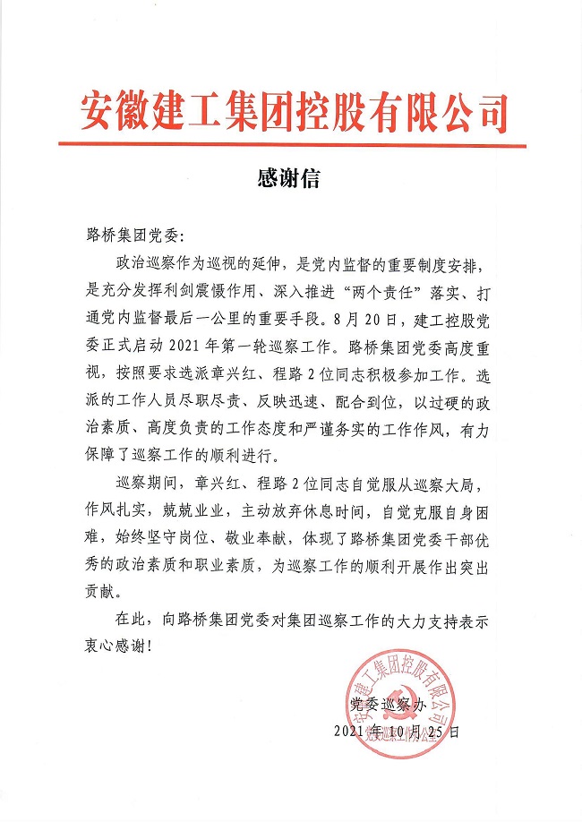 近日,建工控股黨委巡察辦發來感謝信,對公司在集團開展的2021年第一輪巡察工作期間,提供的高質量服務保障和作出的突出貢獻表示感謝。