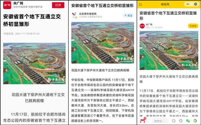 11月18日,安徽惟一重點(diǎn)新聞門戶網(wǎng)站——中安在線于首頁頭版位置以《安徽省首個地下互通立交橋初顯雛形》為題,以圖文形式,聚焦安徽路橋集團(tuán)濱湖科學(xué)城花園大道項目施工進(jìn)展情況,對項目創(chuàng)下全省市政道路建設(shè)史上的多項第一予以重點(diǎn)報道。稿件隨后被學(xué)習(xí)強(qiáng)國、人民日報客戶端、人民網(wǎng)、央廣網(wǎng)、北青網(wǎng)、騰訊網(wǎng)、新浪網(wǎng)等多家主流媒體轉(zhuǎn)載發(fā)布,路橋集團(tuán)建設(shè)者攻堅克難,斗志昂揚(yáng)的良好精神風(fēng)貌被予以細(xì)致描繪,公司良好企業(yè)形象得到進(jìn)一步彰顯。