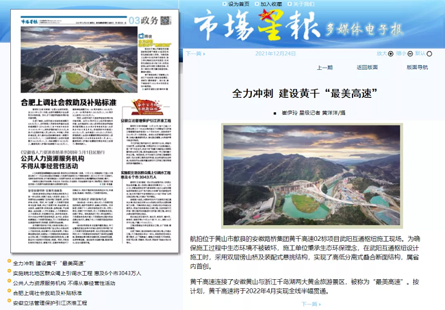 安徽路橋集團黃千高速02標項目自開工以來,克服地形結構復雜等施工難度,科學合理制定施工計劃,積極投入人力、物力,精心部署,有效打開了工程施工局面,在保證工程質量的前提下,以跑步前進的速度推進項目建設。項目建設畫面入選由安徽畫報社出品的中宣部“走出去”外宣項目——《美美與共•中國長三角》長三角一體化發展戰略實施三周年紀實畫冊(中英文),項目施工的進展情況與獨特施工工藝多次獲得中安在線、《市場星報》、北青網、新浪網等主流媒體的詳細報道。