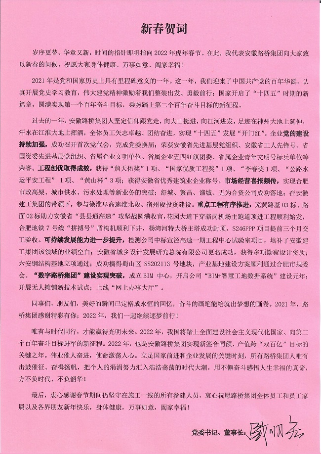 歲序更替、華章又新,時間的指針即將指向2022年虎年春節(jié)。在此,我代表安徽路橋集團(tuán)向大家致以新春的問候,祝愿大家身體健康、萬事如意、闔家幸福!