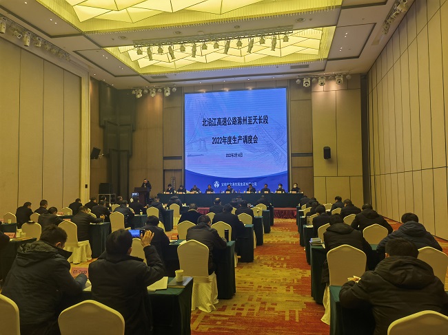錢東升一行深入安徽路橋集團滁天高速04標項目施工現場,實地查看了項目建設進展和復工復產情況,并召開滁天高速公路項目2022年生產調度會議,各參建單位企業主要領導、項目負責人及地方政府有關領導和政府部門主要負責同志參加會議,會議由黃學文主持。會上,項目辦主任向與會人員做了項目工作報告,并對2022年工作計劃進行部署,安徽路橋集團滁天高速04標李景春代表各參建施工單位項目經理發言,介紹了滁天高速04標2021年度建設情況,并對2022年決戰通車目標進行表態。