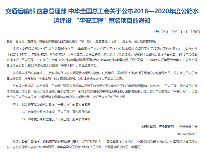 作為我國公路水運(yùn)工程建設(shè)領(lǐng)域安全生產(chǎn)管理方面的最高榮譽(yù),“平安工程”有著安全管理領(lǐng)域“魯班獎(jiǎng)”的美譽(yù),冠名項(xiàng)目均為全國各地建設(shè)規(guī)模大、施工工藝復(fù)雜、作業(yè)安全風(fēng)險(xiǎn)高、建設(shè)成效顯著的建設(shè)工程。