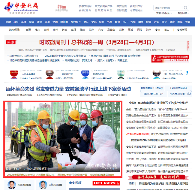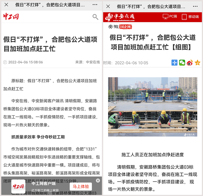 4月6日,中安在線以《假日“不打烊”,合肥包公大道項(xiàng)目加班加點(diǎn)趕工忙》為題,于網(wǎng)站首頁(yè)圖片新聞?lì)^版位置對(duì)路橋集團(tuán)包公大道03標(biāo)項(xiàng)目清明假期期間的疫情防控與項(xiàng)目建設(shè)進(jìn)行重點(diǎn)報(bào)道。稿件獲中華全國(guó)總工會(huì)主管主辦、工人日?qǐng)?bào)社領(lǐng)導(dǎo)和管理的大型綜合性中央新聞網(wǎng)站中工網(wǎng)轉(zhuǎn)載。