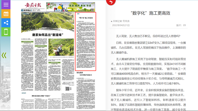 4月21日,《安徽日報》于09經濟視點版以《“數字化”施工更高效》為題,聚焦安徽路橋集團在智能建造方面的探索與應用,重點介紹所屬設備租賃公司無人攤鋪技術、指揮官系統應用與檢測公司檢測裝備“黑科技”、安路e檢小程序等。