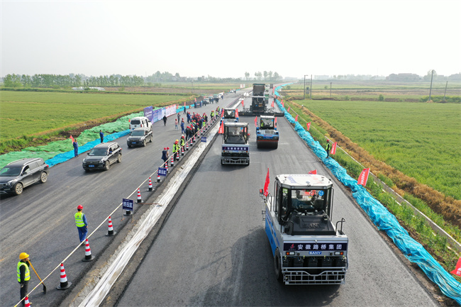 無人攤鋪機群施工采用了自動駕駛、智能壓實和可視化等技術,由北斗衛星定位導航,全流程數據協同,實現24小時不間斷施工,大大提升了路面的平整度與施工效果。“數字化施工一天可以攤鋪4000噸混合料,相當于一天攤鋪2公里路面。”安徽路橋集團設備租賃公司總經理朱小軍介紹,與傳統攤鋪方式相比,無人攤鋪機施工效率可以提高70%,人力成本可以減少80%。