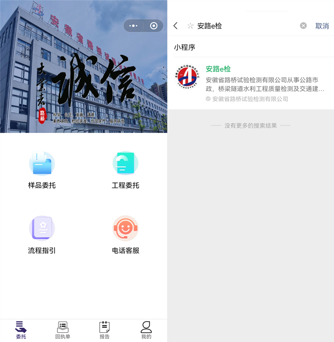 2021年底,安徽路橋集團檢測公司自主研發并發布“安路e檢”微信小程序,實現遠程辦理委托、在線簽名確認回執、一鍵快遞樣品、查詢檢測進度及檢測報告等功能,幫助客戶足不出戶完成委托,給客戶帶來真正的便利。