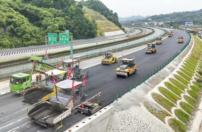 報(bào)道指出,5月19日,在黃千高速與杭瑞高速接駁匝道路面施工現(xiàn)場(chǎng),運(yùn)料車(chē)不斷往返、攤鋪機(jī)、壓路機(jī)有序運(yùn)行,工地上機(jī)聲轟鳴,施工場(chǎng)面熱火朝天。